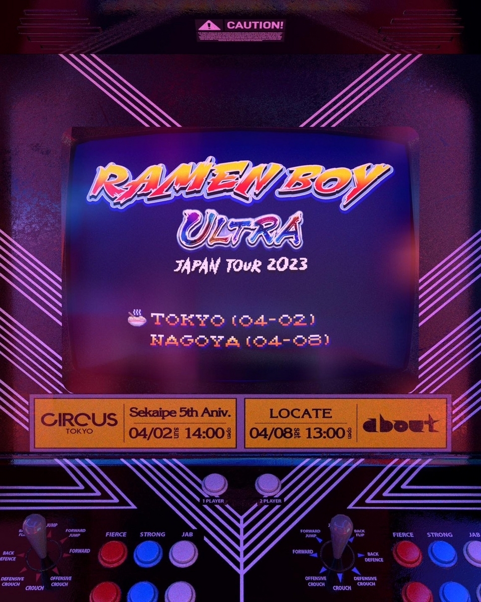 Sekaipe 5th Aniv. -Ramen Boy Japan Tour Tokyo- 4/2(SUN.) 14:00 open at CIRCUS TOKYO Door.3000 + 1D Adv.2500 + 1D -Main Floor- Ramen Boy (From California) andrew (TREKKIE TRAX) SUNOKO sharla pìccolo illequal GLO kei-9 B2B da→sima Lounge Floor NirBorna IX/ON K4ZUY4 oddrella chikuwa.jp kiyo Camera ame_ba_bot staff nick kinsei NINI○