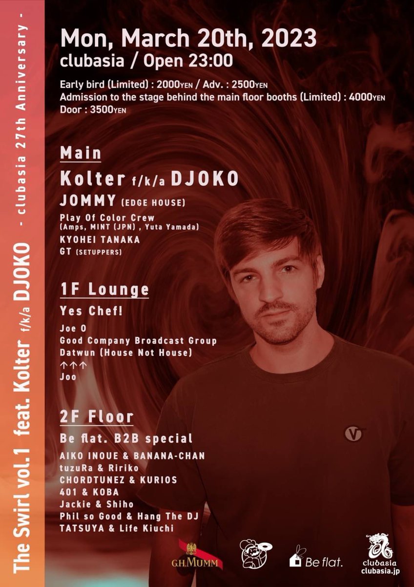 世界基準の音楽を届けるべく、世界で活躍中のアーティストをフィーチャーしたパーティー”The Swirl”が始動。記念すべき第1回目はドイツのプロデューサーである”Kolter f/k/a DJOKO”をゲストに迎えての開催となる。