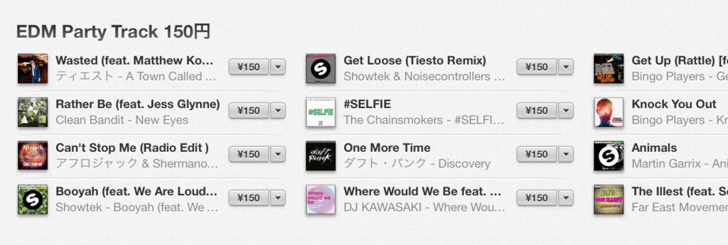 先日iTunesでEDMアルバムがセール中だとお伝えしたのですが、シングルも17曲だけ(ちょっと)セール中のようです。iTunesではシングルは基本的に1曲250円or200円のなんですが、150円になってます。EDM Bananaはリストのうち何曲かを200円で購入済みですが、50円も安くなってるしw25%OFFだし!というわけで...