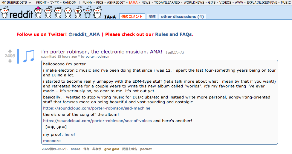RedditというサイトのAsk Me Anytingコーナー(Ask.fmとか◯◯だけど質問ある?とかそんな感じです)にPorter Robinsonが出ていました。個人的に全部読んでおきたいので、何回かに分けて翻訳していきます。 (Sad Machineのボーカルで使われているボーカロイドの)Avannaはどうやって見つけたの?...