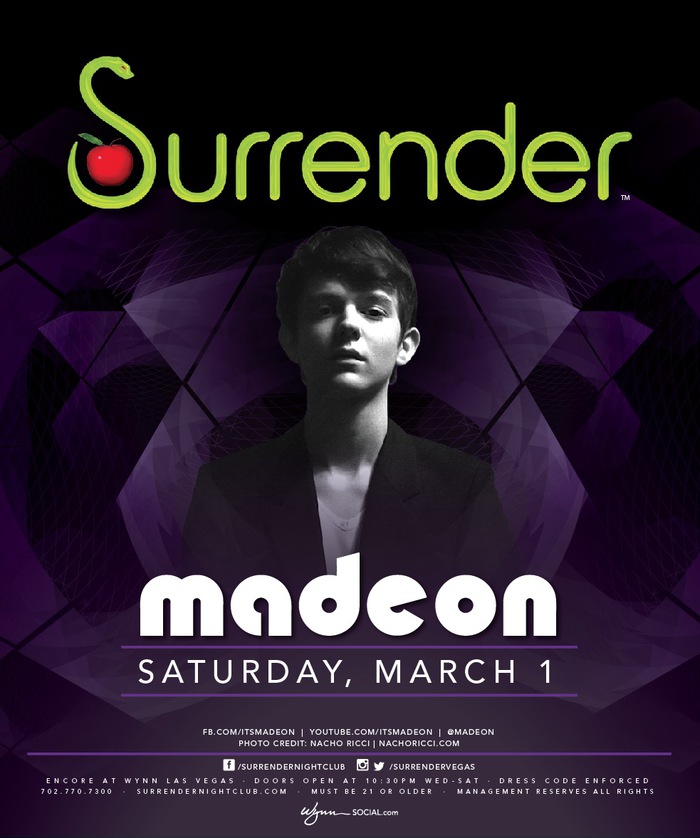 ラスベガスのWynnというホテルにあるクラブ「Surrender」にてライブ予定だそうです。長らくスタジオにこもっているmadeon君ですが、新曲の披露とかしてくれるのでしょうか?学生さんで春休みの方は行ってみてはいかがでしょう。 ちなみにWynnの2月のスケジュールは相変わらずすごくて、MAKJ、DIPLO、Deorro、Dill...